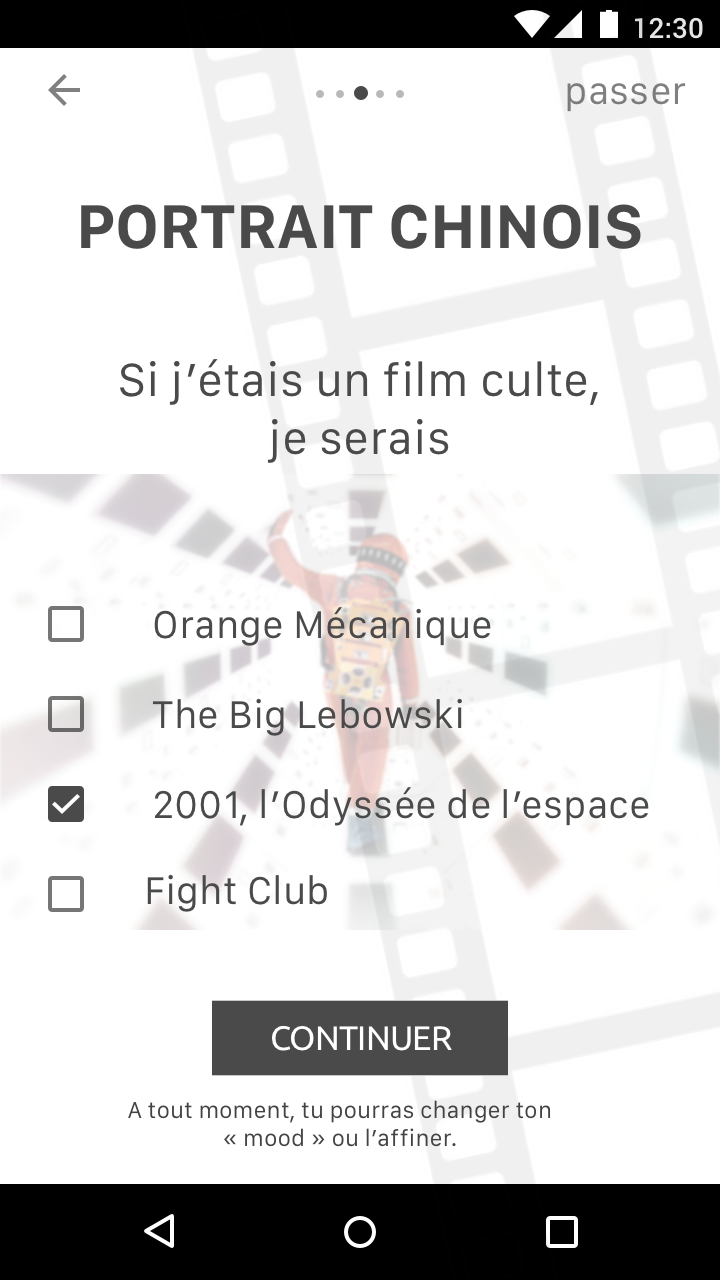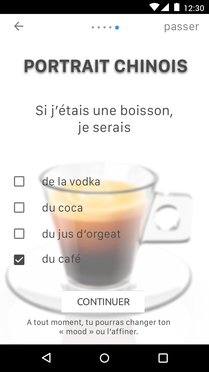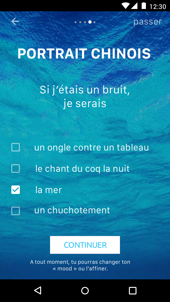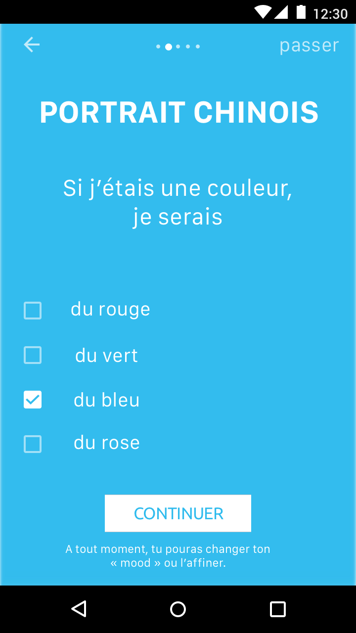 During the onboarding, the application sets the tone by proposing a Chinese portrait questionnaire and a choice of emoticons to determine your mood.